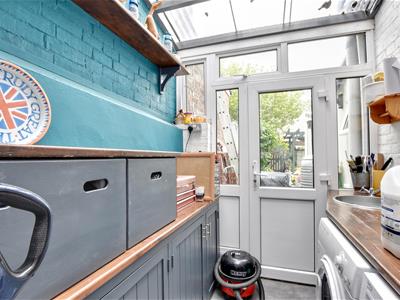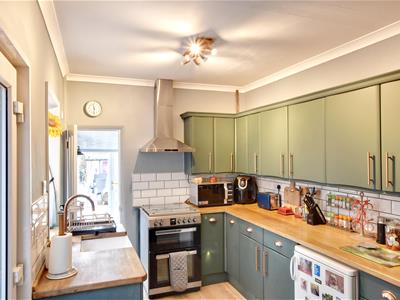 3.25m x 1.78m (10'8 x 5'10)Worktop with an inset sink bowl, space beneath and plumbing for washing machine and dishwasher, range of built-in cupboards, door to the rear, tiled floor.