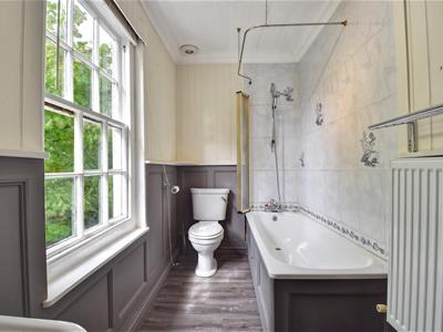 Fitted with a white suite comprising low level wc, pedestal wash hand basin, wooden panelled bath with mixer tap, shower over and fitted folding screen, part tiled walls, part wood panel walls, wood effect flooring, radiator, window to the side elevation.