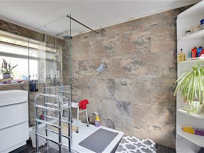 Modern suite comprising WC with low level flush, vanity unit, wash hand basin and mixer tap, walk-in shower cubicle with chrome wall mounted shower controls, attachment and shower head with an additional rain effect shower head. Dual aspect obscured double glazed windows to both elevations, double radiator, additional chrome heated towel rail, tiled walls.