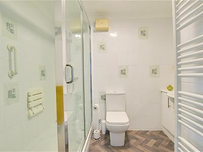 Suite comprising heated towel rail, inset wash hand basin with vanity unit and drawers beneath, mirror and light, wc with low level flush, walk-in shower cubicle with sliding door and chrome controls, chrome shower head, tiled walls.