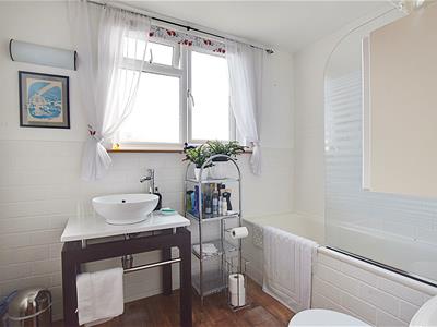 Modern suite comprising wc with low level flush, wash hand basin with mixer tap, panelled bath with chrome hot and cold tap, traditional shower above with chrome attachment and showerhead, obscured double glazed window to the rear elevation.