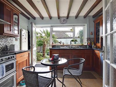 3.56m x 3.28m (11'8 x 10'9)Modern fitted kitchen with a range of matching wall and base level units, laminate straight edge worktop surfaces, one and a half bowl sink with drainer and mixer tap, space for freestanding cooker, extractor canopy, space and plumbing for dishwasher, tiled splashbacks, double glazed windows and door overlooking and giving access onto the rear garden, exposed beams.