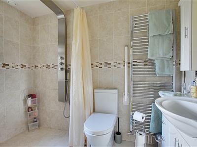 Wc with low level flush, wash hand basin with mixer tap and wall mounted shower controls, chrome shower attachment and showerhead, part tiled walls.