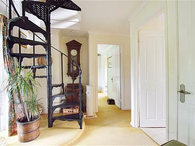 With obscure glass panelled entrance door, storage cupboard, radiator, spiral staircase leading to the first floor landing.
