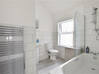 A modern suite comprising low level wc, pedestal wash hand basin with mixer tap, panel enclosed bath with chrome mixer tap with additional shower over bath with chrome controls, chrome hand shower attachment and shower head, chrome heated towel rail, part tiled walls, obscure double glazed window to the side elevation.