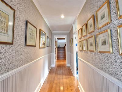 With stairs rising from the hallway, sash window to the side elevation, electric storage heater, exposed floorboards, stairs rising to the second floor, doors leading to: