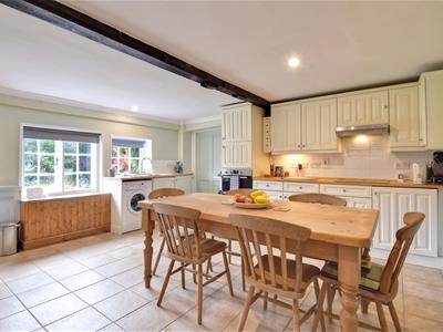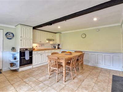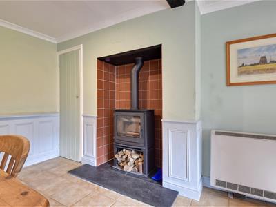 4.70m x 4.57m (15'5 x 15' )Fitted with a range of traditional style cupboard and drawer base units with matching wall mounted cupboards, complimenting woodblock work surface with inset sink drainer unit, inset four ring Hotpoint electric hob with extractor canopy above, upright units housing integrated double oven, integrated low level fridge, space and point for washing machine, electric storage heater, half wood panelled walls with shelf over, tiled flooring, feature fireplace with inset log burning stove, fitted airing cupboard housing insulated hot water tank, two windows to the rear elevation enjoying pleasant views over the garden, space for table and chairs. fitted storage cupboard, door leading to: