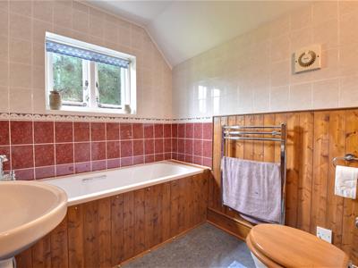 Fitted with a white suite comprising low level wc, pedestal wash hand basin, wood panelled bath with mixer tap and hand-held shower attachment, stainless steel heated towel rail, part tiled walls, half wood panelled walls, obscure glazed window to the rear elevation.
