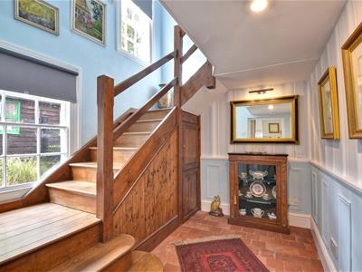Oak staircase rising to the first floor with fitted storage cupboard beneath, quarry tiled flooring, sash window to the side elevation, half wood panelled walls.