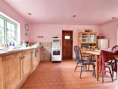 5.21m x 4.04m (17'1 x 13'3)Double aspect, side door onto garden, Base and eye level units comprising space for washing machine, tumble dryer and cupboard space, sink with window over, free standing oven and fridge/freezer.