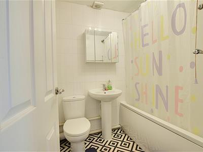 Suite comprising panelled bath with hand shower attachment and fixing, shower screen, curtain rail, wc with low level flush, pedestal wash hand basin, single radiator, tiled walls.