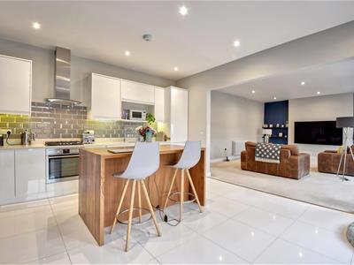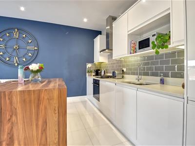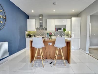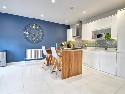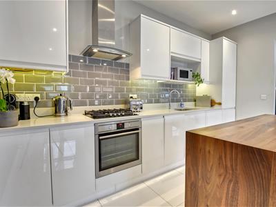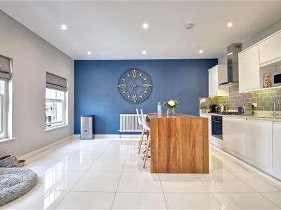 5.03m x 4.06m (16'6 x 13'4)Extensively fitted with a range of modern style 'white high gloss' cupboard and drawer base units with matching wall mounted cupboards, complementing work surface with inset 1.5 bowel stainless steel sink units and tiled splash-backs, inset four burner gas hob with integrated oven beneath and stainless steel extractor canopy above, integrated fridge/freezer, integrated slimline dishwasher, integrated washing machine, kitchen island with breakfast bar, cupboard housing wall mounted gas fired boiler, space for table and chairs, tiled flooring, radiator and two sash windows to the front elevation enjoying delightful views across the High Street.