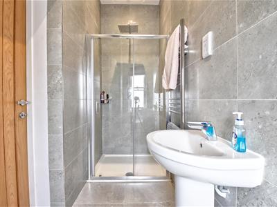Fitted with a contemporary suite comprising low level wc, pedestal wash-hand basin, large fully tiled shower cubicle with sliding door, stainless steel heated towel rail, obscured glazed sash window to the side elevation, recessed ceiling spot lights, fully tiled walls and flooring.