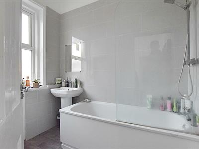Modern suite comprising wc with low level flush, pedestal mounted wash hand basin with mixer tap, panelled bath with chrome mixer tap, wall mounted shower controls, hand shower attachment and additional rain effect showerhead, chrome heated towel rail, part tiled walls, obscured double glazed window to the rear elevation.