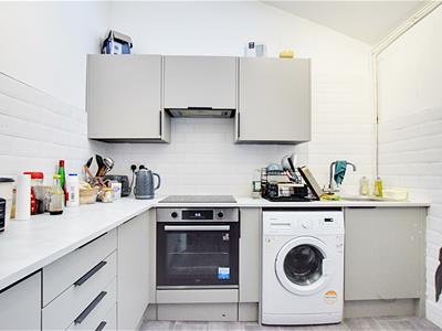 2.71m x 2m (8'10" x 6'6" )Modern fitted kitchen with a range of matching wall and base level units with laminate straight edge worktop surfaces, single drainer with mixer tap, integrated electric oven, four ring electric hob and extractor fan above, space and plumbing for washing machine, tiled splashbacks, obscured glass panelled door leading to the sun balcony, velux window, radiator.