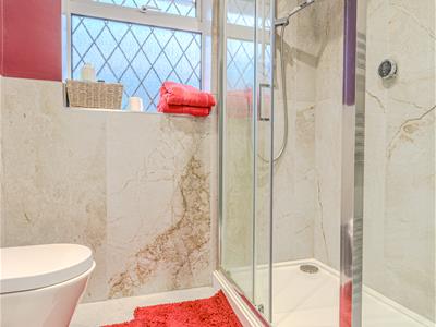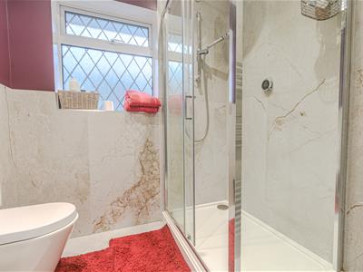 2.13m x 1.73m (7' x 5'8)Comprising a concealed low level wc, vanity wash hand basin with mixer tap and storage cupboard beneath, large walk -in shower cubicle with fixed rainfall showerhead and hand held attachment, tiled floor, part tiled walls, inset ceiling lighting, chrome heated towel rail, extractor fan, double glazed obscure window to rear aspect.