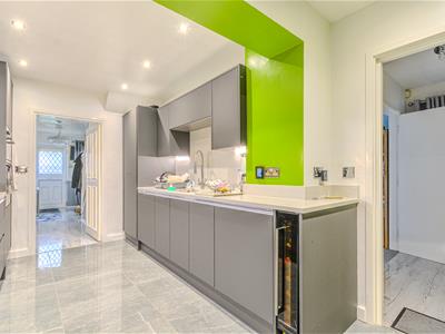 4.57m x 2.74m to the maximum (15' x 9' to the maxiThis stunning modern contemporary kitchen comprises of matching wall and base mounted units with quartz worksurface over and matching upstand with an inset one and a half bowl sink with pull out mixer tap, Bosch four ring gas hob with cooker hood over, Bosch integral oven and grill, integral Bosch microwave, integral fridge/freeze and wine cooler. Built in breakfast bar/study area with window overlooking the conservatory, combination of inset, pendant, under unit and under work surface lighting, high gloss tiled floor with underfloor heating, contemporary wall mounted vertical radiator, wooden and glazed door leading into: