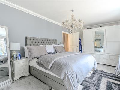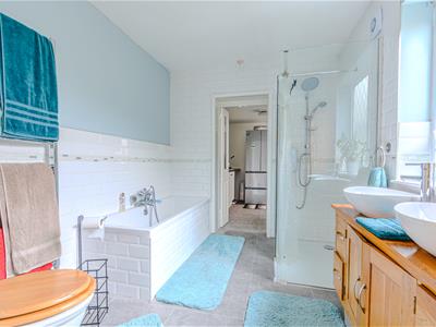 3.05m x 2.46m (10' x 8'1)This luxuriously well appointed suite comprises a high level wc, doubled ended bath with mixer tap and shower attachment, large walk-in shower cubicle with fixed glass screen, hand held attachment and fixed rainfall showerhead, his and hers oval wash hand basins on a bespoke vanity unit with mixer taps, extractor fan, chrome heated towel rail, under floor heating, double glazed obscure window to side aspect and door leading into: