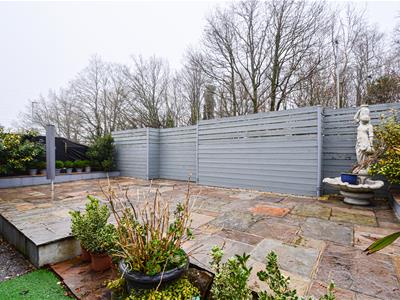 Easy low maintenance garden which is enclosed with fencing with an elevated sandstone paved terrace ideal for outdoor entertaining and raised beds, side access, exterior lighting and water tap.