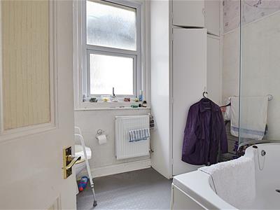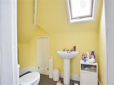 Suite comprising panelled shower bath with hand shower attachment, low level wc, pedestal wash hand basin, double radiator, built in airing cupboard, obscure glass window to the side elevation.