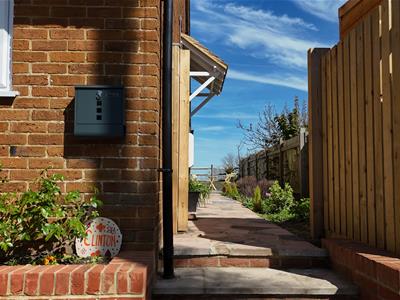 Hardstanding which provides off road parking for two cars, gated pathway to the right, bordered by an established shrub bed and leading to the rear garden.