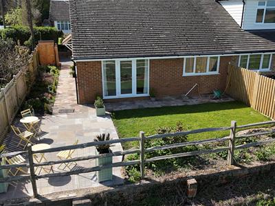 Paved areas, level lawn and further stocked border, post and rail fence to the rear, palisade fencing to either side, far reaching views are enjoyed over the Brede Valley to Rye.