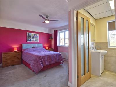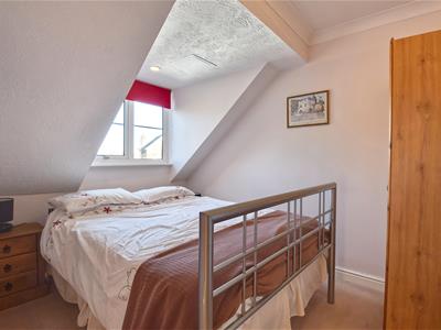 4.67m max x 3.43m (15'4 max x 11'3)Window to the front elevation, range of fitted wardrobes, fitted above stairs storage cupboard, radiator, part obscure glazed oak door leading through to:
