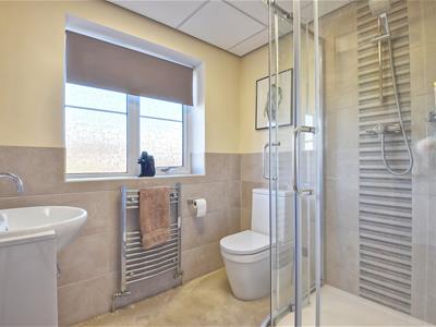 Obscure glazed window to the front elevation, fitted with a modern white suite comprising low level wc, white gloss floor standing vanity unit with inset wash hand basin and fitted storage cupboard beneath, large corner shower cubicle with double sliding doors and fitted power shower, part tiled walls, stainless steel heated towel rail, recessed fitted mirrored cupboard.