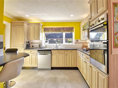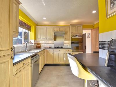 3.53m max x 3.43m max (11'7 max x 11'3 max )L-shaped with window to the rear elevation overlooking the garden, fitted with a range of traditional style cupboard and drawer base units with wall matching cupboards, complementing granite effect work surface with tiled splashback, inset one and a half bowl stainless steel sink unit with side drainer, inset four burner gas hob with stainless steel backplates and extractor canopy above, upright unit housing integrated double oven, integrated fridge/freezer, space and plumbing for dishwasher, generous fitted breakfast bar, tile effect flooring, radiator, under/above cabinet lighting, doorway leading through to:
