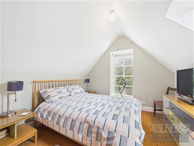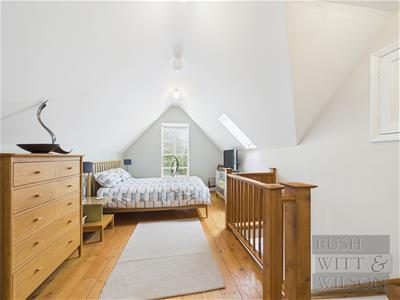 The principal bedroom is on the first floor andfeatures a vaulted ceiling, polished wood flooring, conservation-style rooflights, and a projecting bay window enjoying far-reaching views. The en-suite bathroom comprises a panelled bath with shower attachment, low-level WC, pedestal wash basin, wood flooring, and a feature round window.