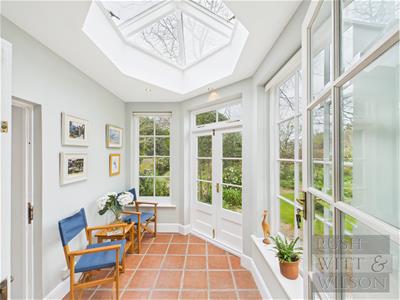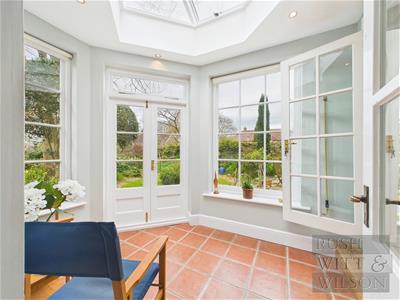 The sunroom/conservatory features a roof lantern, tiled flooring, and French doors opening onto the garden.