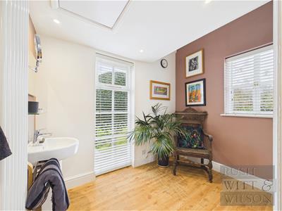 The family room is accessed from the drawing room and provides a comfortable second reception space with a sash window overlooking the garden. Steps lead down to the utility/boot room (formerly the garage), which is fitted with tiled flooring, built-in cupboards, shelving, wine store, and provides space and plumbing for a washing machine, tumble dryer, and additional fridge freezer.