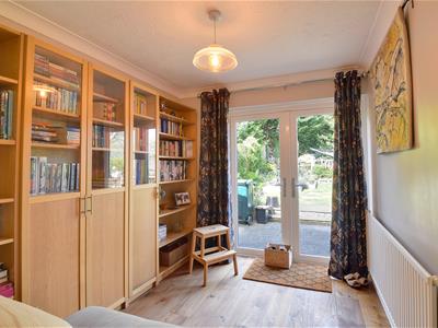 2.84m x 2.34m (9'4 x 7'8 )Glazed double doors to the rear elevation allowing access through to the garden, range of fitted storage/display shelving units, wooden flooring, radiator, door leading to:-