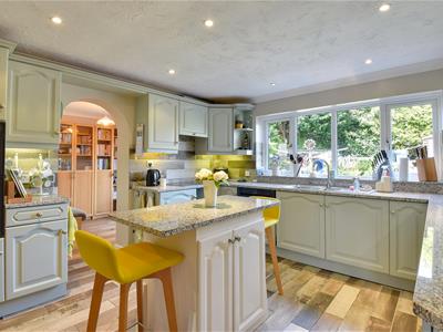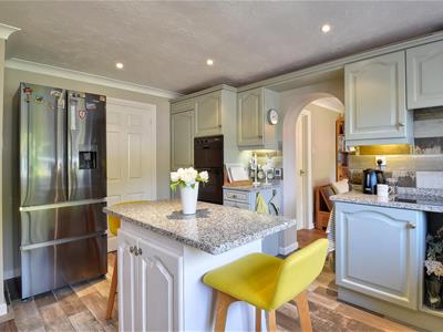4.32m x 3.56m (14'2 x 11'8 )Extensively fitted with a range of traditional style cupboard and drawer base units with matching wall mounted cupboards, complimenting granite work surface with matching splashback and inset stainless steel one and a half bowl sink drainer unit, inset five ring electric hob with extractor canopy above, upright unit housing integrated double oven, integrated dishwasher, central kitchen island with granite work surface/fitted breakfast bar, space and point for free standing fridge/freezer, tiled flooring, large walk-in shelved pantry cupboard, window to the rear elevation overlooking the garden and archway leading to:-