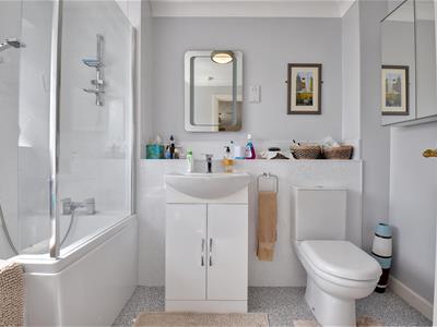 Fitted with a modern suite comprising low level wc, floor standing white gloss vanity unit with inset wash hand basin and fitted storage beneath, "P" shaped panelled bath with mixer tap, shower over and fitted screen, wall mounted stainless steel heated towel rail and obscure glazed window to the front elevation.