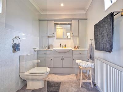 Fitted with a modern suite comprising low level wc, extensive vanity unit with range of storage, inset wash hand basin, generous walk-in shower with fitted glass screen, radiator and obscure glazed window to the side elevation.