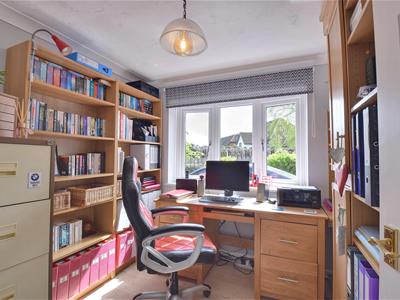 2.46m x 2.34m (8'1 x 7'8 )Window to the front elevation, range of fitted storage cupboards, display shelving and desk, wooden flooring and radiator.