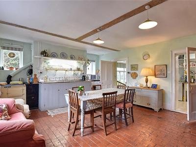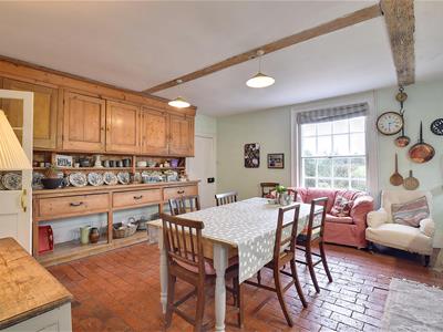 4.75m x 2.46m (15'7 x 8'1 )Fitted with a range of base cupboard units with stainless steel double sink/drainer unit above, oil fired Aga, attractive fitted wooden dresser, space and plumbing for washing machine, space and point for dishwasher, radiator, exposed brick flooring, sash window to the front, two further windows to the side elevations, door leading to: