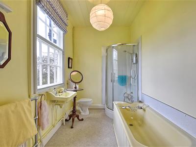 Fitted with a suite comprising low level wc, pedestal wash hand basin, wooden panelled bath with mixer tap and hand held shower attachment, corner shower cubicle with double sliding doors, radiator with stainless steel heated towel rail fitment, sash window to the side elevation, further door accessed off of the landing.