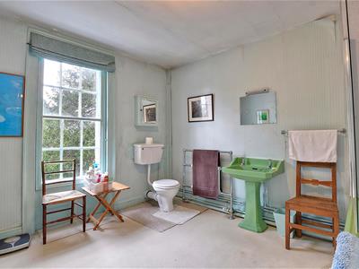 Fitted with a white low level wc, coloured wash hand basin, coloured bath with mixer tap and fitted shower above, radiator with stainless steel heated towel rail fitment, sash window to the side elevation.