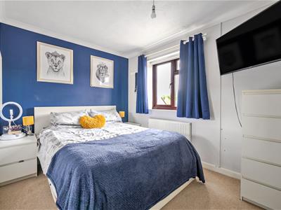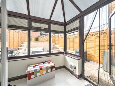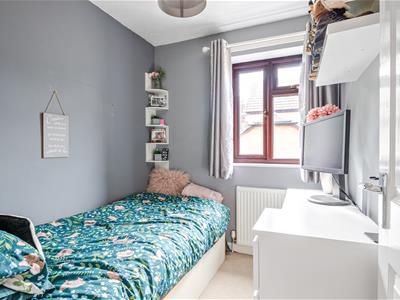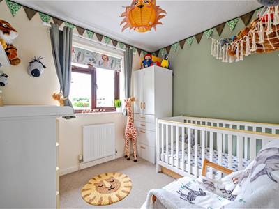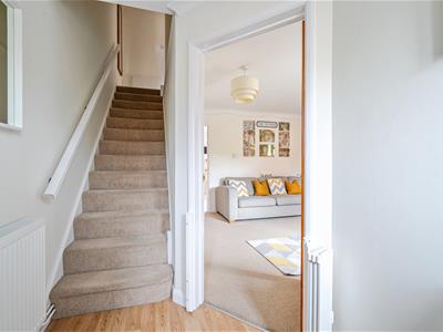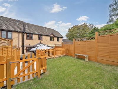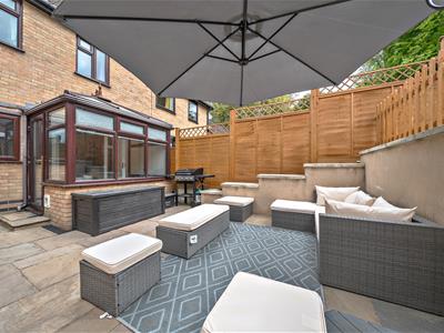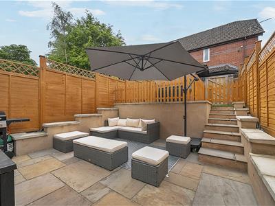 Outside, there is tandem parking for 2-3 cars in front of a single garage (to the left hand side with the red door), with an attractive south easterly facing enclosed garden to the rear of the property. The garden has been landscaped to include an extended patio sun terrace with steps rising to a lawn and a rear access gate.