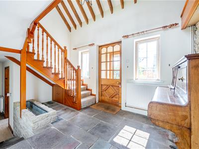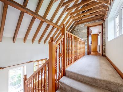 The internal accommodation is arranged over three levels, and briefly comprises; entrance porch, large entrance hall with beautiful vaulted and beamed ceiling , and original slate flooring, sitting room with wood burner and bay-fronted French doors to the rear patio area, newly appointed kitchen / diner, study, and cloakroom, on the ground level.