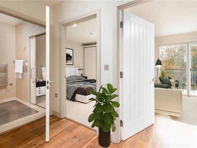 This stunning 1-bedroom pre-owned retirement apartment is operated by Rangeford Villages. Situated in the Pavilion building, the hub of the village. This apartment has a large picture window in the living room with a west-facing balcony showing amazing views across the countryside. The kitchen with integrated Bosch appliances including oven, hob, washer dryer, dishwasher and a fridge with freezer compartment. A large bedroom with fitted double wardrobes and a Juliette balcony. En-suite shower room with Porcelanosa sanitary ware, featuring a ceramic tiled floor with mosaic tiles in the shower area. Heated towel rail and illuminated mirror. Engineered walnut hardwood high-quality flooring with thermostatically controlled underfloor heating via a centralised system.