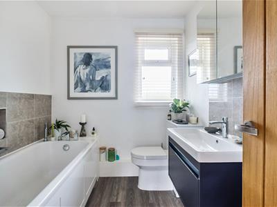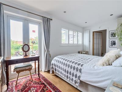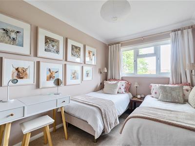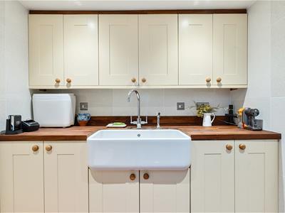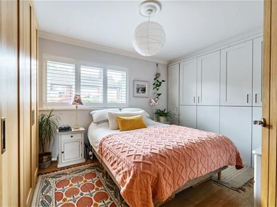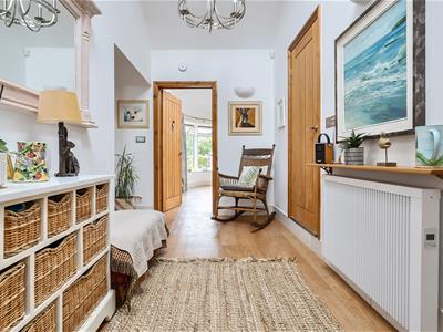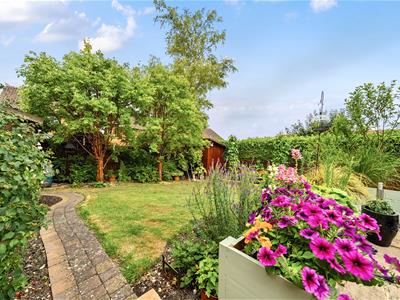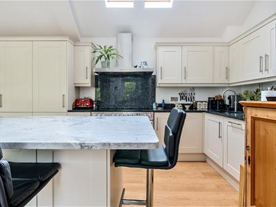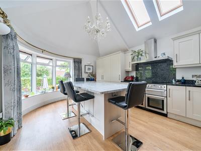 A light and welcoming vaulted entrance hall with wood effect flooring has oak doors leading off to a useful utility room and a stylish refitted shower room, that is fully tiled with a walk-in double width shower and vanity unit. The kitchen is a standout feature of this home, with its vaulted ceiling and central island/breakfast bar with large white granite worktop and contrasting black granite worktops and fitted units. There is a 'Range' style cooker, Quooker tap, integrated fridge/freezer, 2 Velux skylights and curved wall with door to the garden. A 15ft bay fronted sitting room has wooden flooring and a log burning stove with a door through to an inner hall with oak doors off to four bedrooms (3 x doubles and 1 single which is currently used as a study with bespoke study furniture desk and wardrobes). The main bedroom has great views over the garden and French doors, whilst the guest bedroom has ample storage through two walls of fitted wardrobes. A contemporary bathroom completes the accommodation.