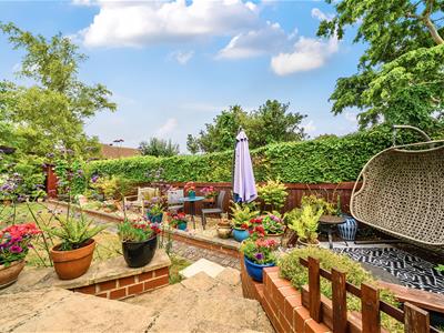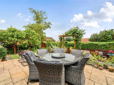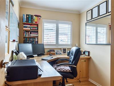 Outside, there is block paved driveway with parking for 3 cars, leading up to the former garage which is now a useful store room with light, power, water and an electric door. The private rear garden has an electric awning over the extended patio sun terrace, with steps down to a lawn, colourful planted borders, established trees and shrubs. In the far comer is a covered decked seating area, with a rise arch, paperbark maple trees and a number of garden sheds providing ideal storage for garden equipment or workshops.