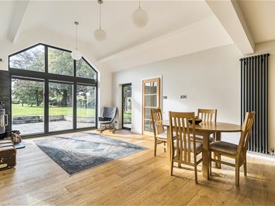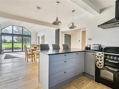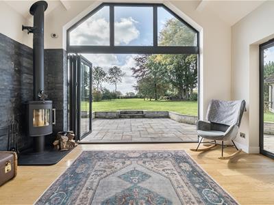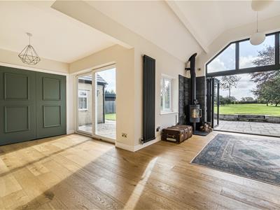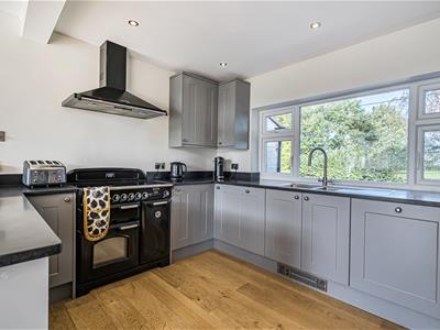 Offered with no onward chain, the property is ready to move straight in and enjoy, and it's versatile layout offers excellent flexibility, with the potential to create a self-contained annex — ideal for multi-generational living or guest accommodation. Approached up a sweeping driveway which provides plenty of parking, the property opens into a lobby then hallway with engineered oak flooring. There is a refitted cloakroom set off the hall. A notable feature of this home is the superb triple aspect 33ft x 29ft open plan kitchen/dining/family room, also with engineered oak flooring. The vaulted family area features a floor to ceiling arched window with inset bi folding doors and a contemporary log burning stove, whilst the dining area has sliding doors to the garden and a useful fitted storage cupboard. The quality kitchen enjoys granite worktops, upstands and a breakfast bar with spaces for a Range style cooker and American fridge/freezer (both available by separate negotiation). In addition there is a walk-in pantry, integrated dishwasher and a larder cupboard, plus a separate utility room. From the family area a door leads into a recently recarpeted sitting room, with a door to the garden and stairs up to a large family bathroom (ready for buyers to put their own stamp on it), a bright dual aspect double bedroom with pleasant countryside views and a wall of fitted wardrobes with ample storage. Three spacious ground-floor bedrooms are served by a contemporary shower room.