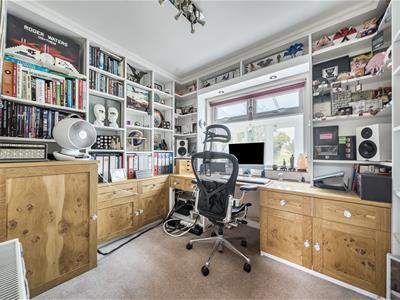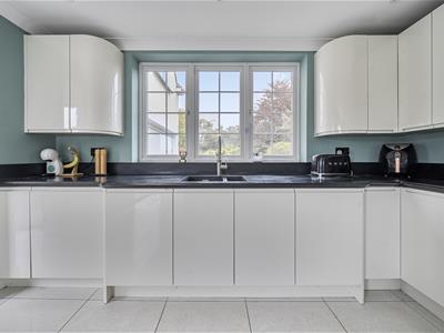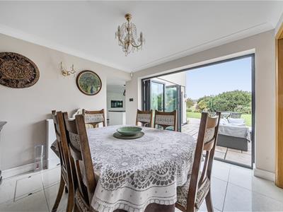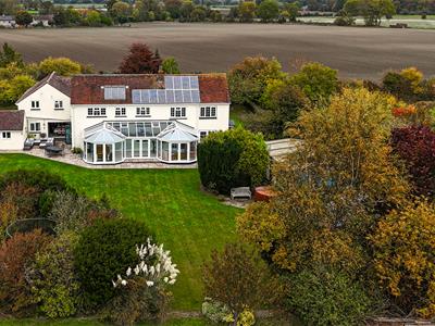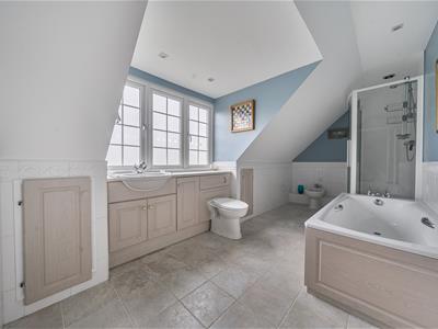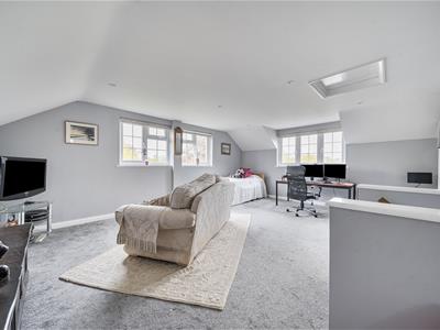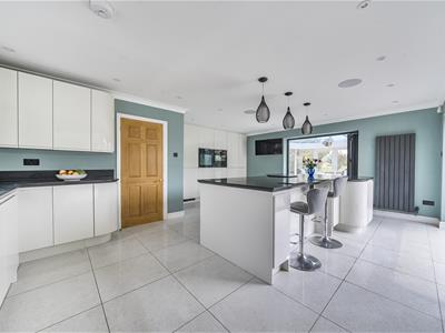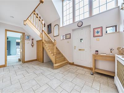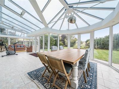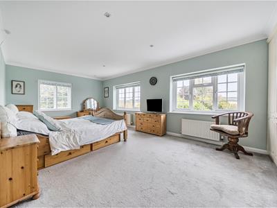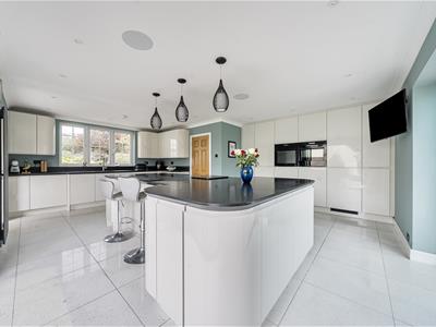 Internally, you are welcomed into an impressive entrance hall with tiled flooring, oak stairs and a gallery landing with a very large feature window. Set off the hall, oak doors open into a downstairs cloakroom, a study with bespoke oak fitted furniture and the 23ft triple aspect sitting room with twin bay windows and a log burning stove with a Bath stone surround. French doors open to the garden as well as into a substantial 36ft conservatory that spans the rear of the home and links back in to the refitted kitchen. The stylish kitchen features large quartz floor tiles, Corian worktops, built-in speakers, twin bi folding doors, an island/breakfast bar and a range of sleek units with integrated quality appliances, including a wine fridge and Quooker tap. There is a separate utility with water softener as well as a dining room with further bi folds leading onto the patio. From the utility, stairs go up to the possible annexe with a big sitting room, double bedroom and shower room. There are four further bedrooms in the main section with a refitted shower room and very generous ensuite bathroom to the 21ft principal bedroom.