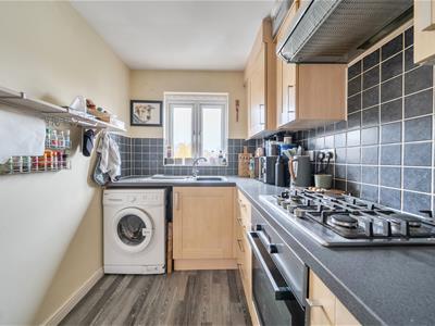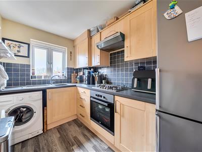 The accommodation is light and airy throughout and comprises a welcoming entrance hall with useful storage cupboards, a generously sized reception room with ample space for both living and dining furniture, and a pleasant dual aspect. The modern kitchen is fitted with a range of wall and base units, an integrated oven and hob, and space for additional appliances, offering plenty of worktop and storage space.