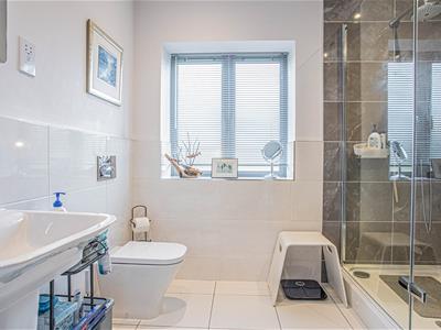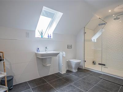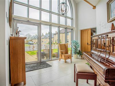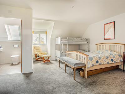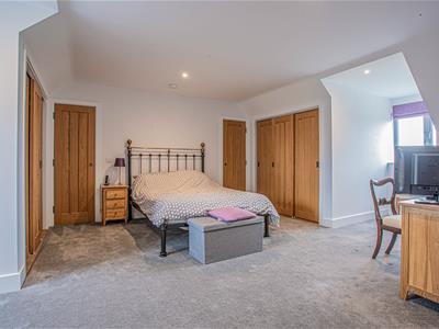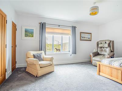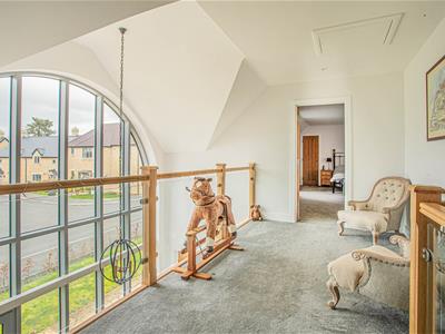 The stunning oak staircase rises up to a galleried landing with westerly facing views through the large feature window. There is a substantial master bedroom suite with a range of fitted wardrobes and en-suite bathroom with separate shower while across the landing is a second spacious bedroom with fitted wardrobes and an en-suite shower room.