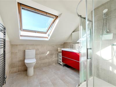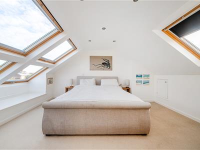 The top floor is dedicated to a stunning principal suite, offering a spacious double bedroom, an abundance of natural light, built-in dressing area, en-suite shower room with dual sinks, and access to eaves storage.
